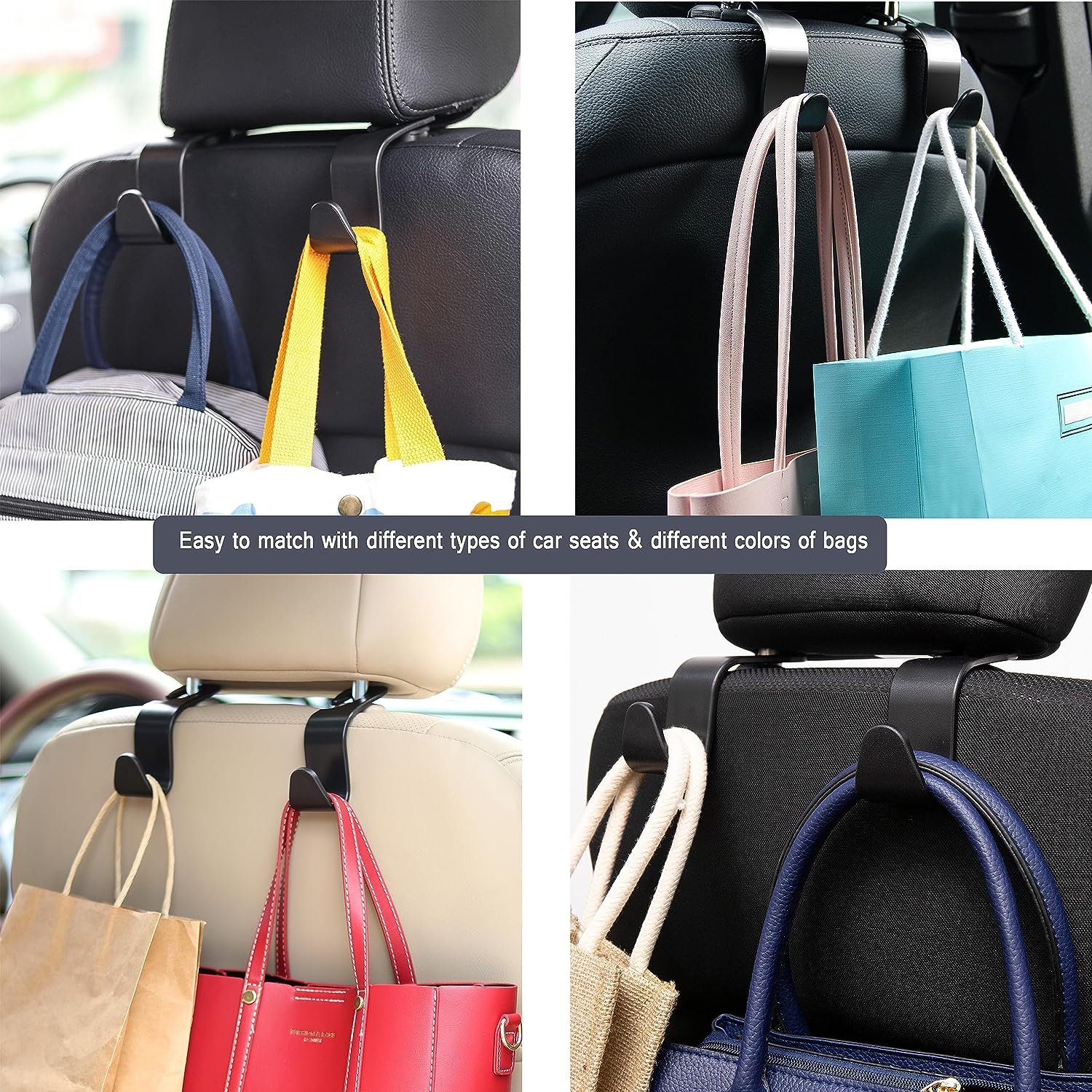 - 360 Degrees Rotation: The hooks can be rotated 360 degrees horizontally after installing. You can swing the hooks around to either the front or back of the seat to use as desired, or hide the hooks under the headrest bar when you don’t need them, space saving and perfect compatible with your car.