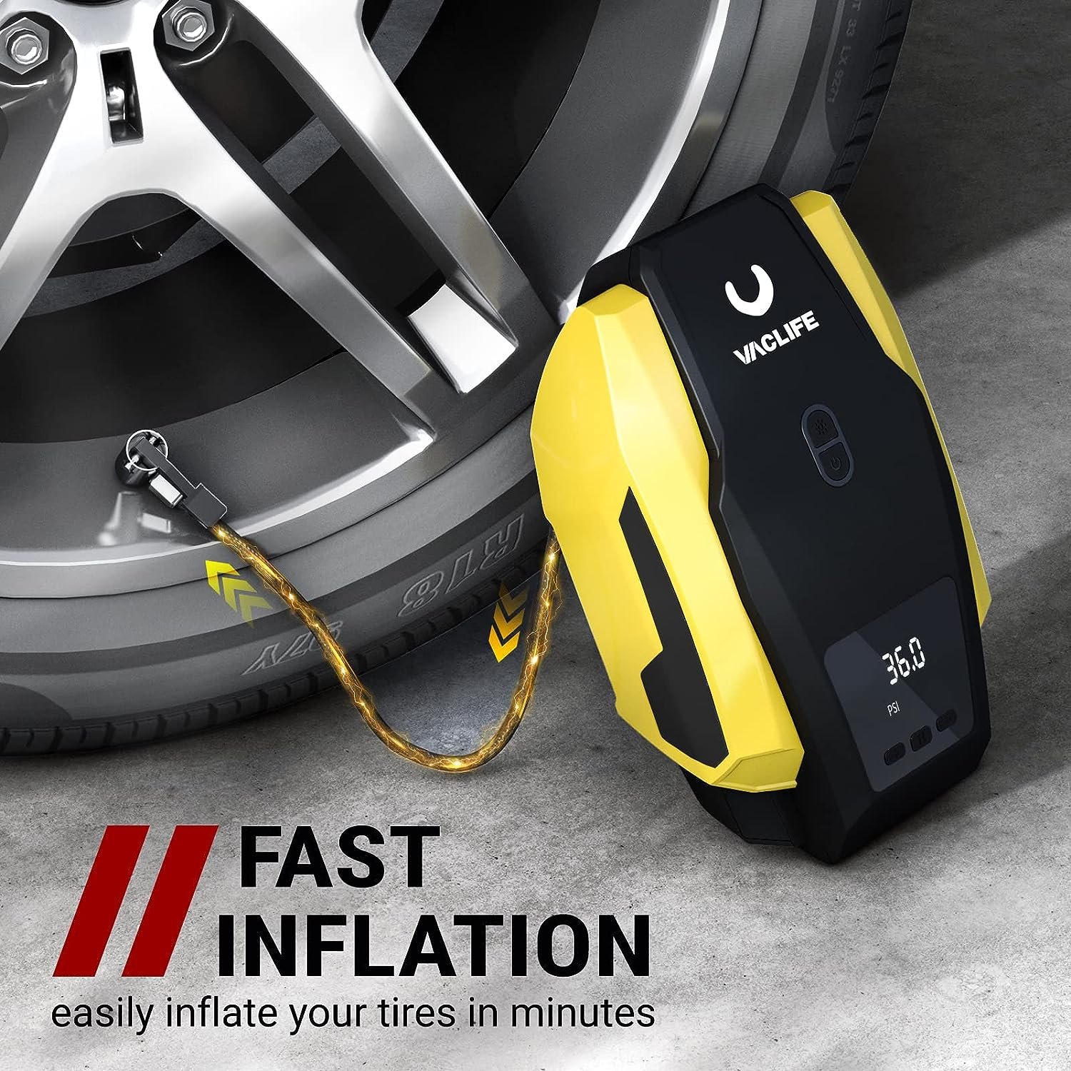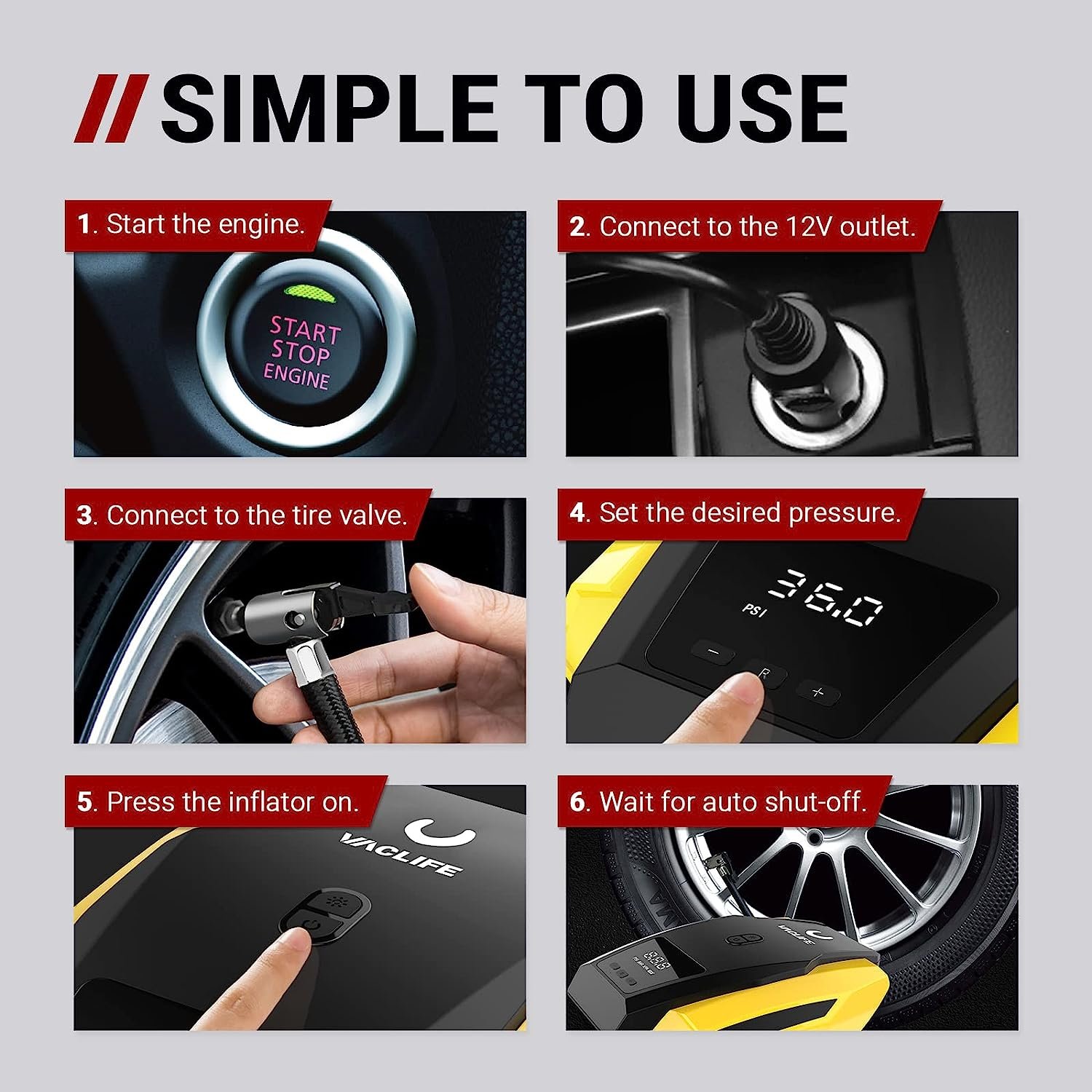 • [AUTO SHUT OFF] Simplicity meets functionality. VacLife car air pump provides you with rest-assured using experience based on the auto-shut off function. Preset the desired pressure level and start inflating job. The car air compressor will shut off automatically at the desired level. There is no need to worry about over inflating, VacLife smart inflator for tires got your back.